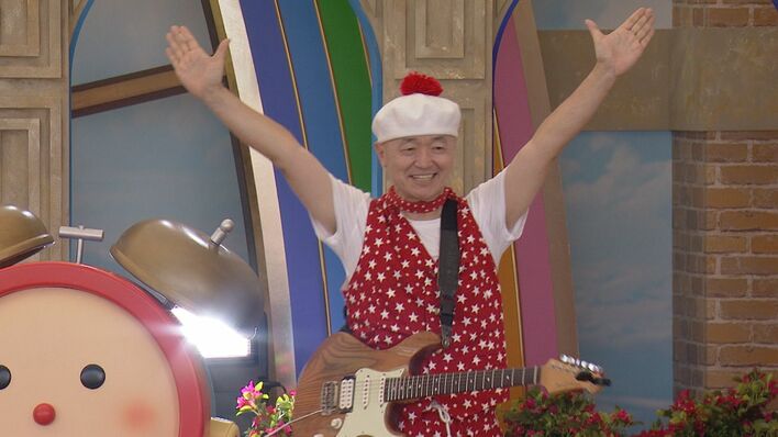 開演のカウントダウンが始まると、フライングで赤と白の衣装姿のパッパラー河合さんが、ギターを手にしてステージに現れ、観客も歓声をあげて盛り上がります。