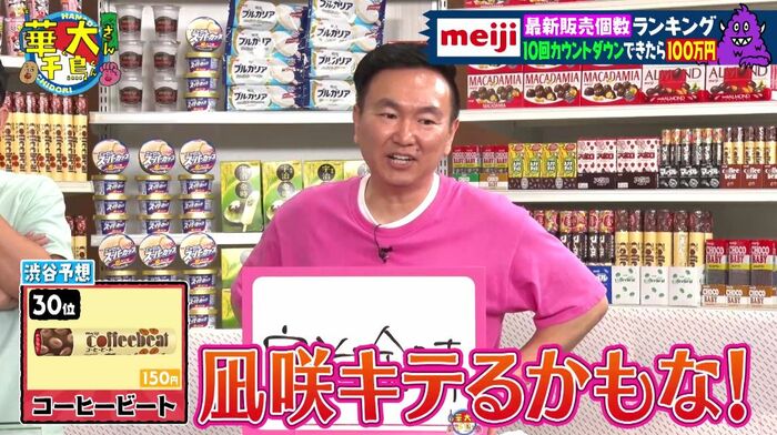 今回は大人気食品メーカー「明治」の人気商品30品(番組がセレクト)の中から、「最新販売個数ランキング」を、順位が下位から上位へとカウントダウンするように予想。