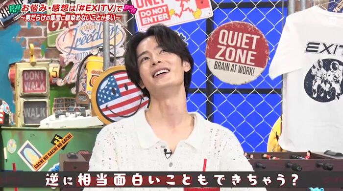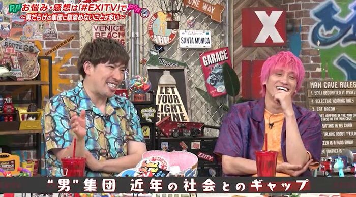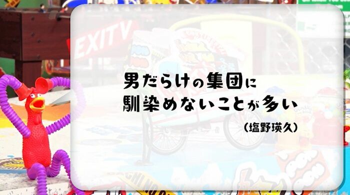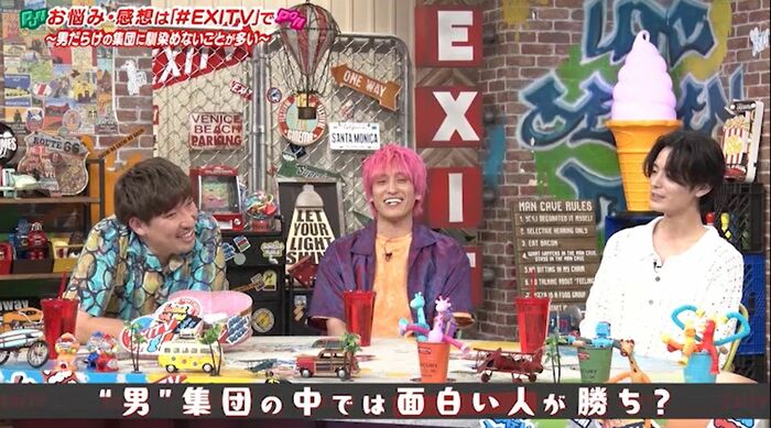 EXITがゲストとリラックスしたトークを繰り広げる『EXITV』(フジテレビ)。8月20日の放送では、ゲストに迎えた塩野さんからの「男だらけの集団に馴染めないことが多い」という相談に答えることに。