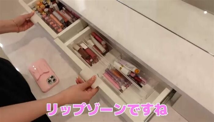 ドレッサーの中にはたくさんのリップや下地など化粧品アイテムが収納されていました。