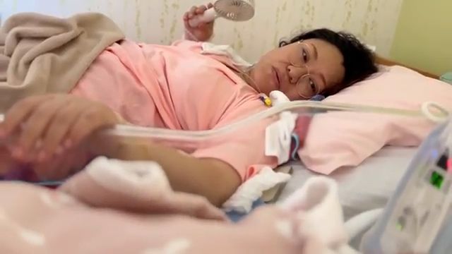 出産直後、生まれたばかりの赤ちゃんが寝ている新生児ベッドに手をかけるバービーさんは疲れたのか目を開いては閉じて、ウトウト…。