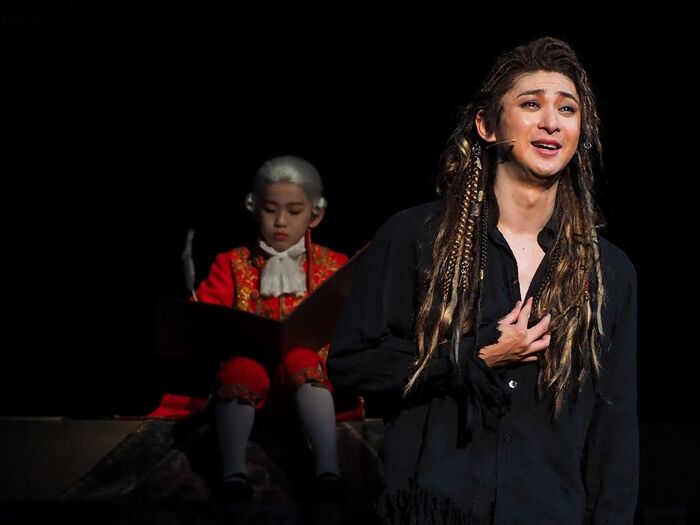 恵まれた体躯を活かし、段差のある舞台セットを軽々と移動する姿は10代の少年のように瑞々しく、さらに、瞳には燃えたぎるような情熱を宿らせ、天才・モーツァルトを巧みに演じました。