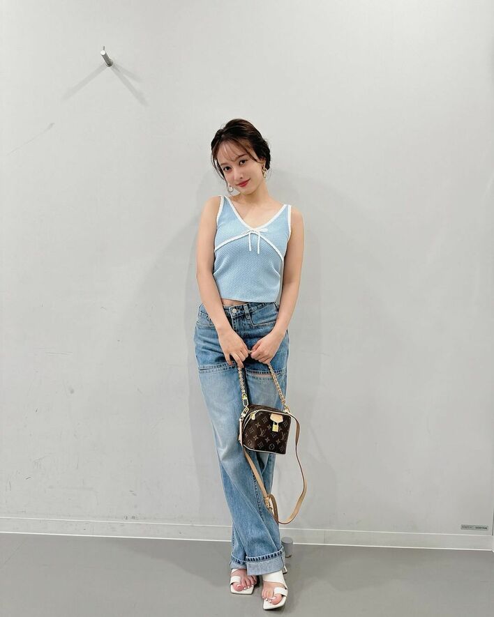 全体的に青色でまとめられた、夏らしさを感じる爽やかなコーデとなっており、少し短めのトップスとデニムの間からおへそがチラリと見えています。