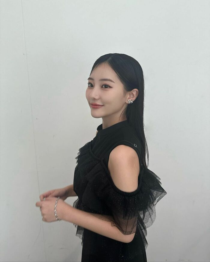 黒のワンピースに髪の毛を下ろしたコーデは大人っぽい雰囲気。耳と腕につけたシルバーのアクセサリーがワンポイントとなっています。