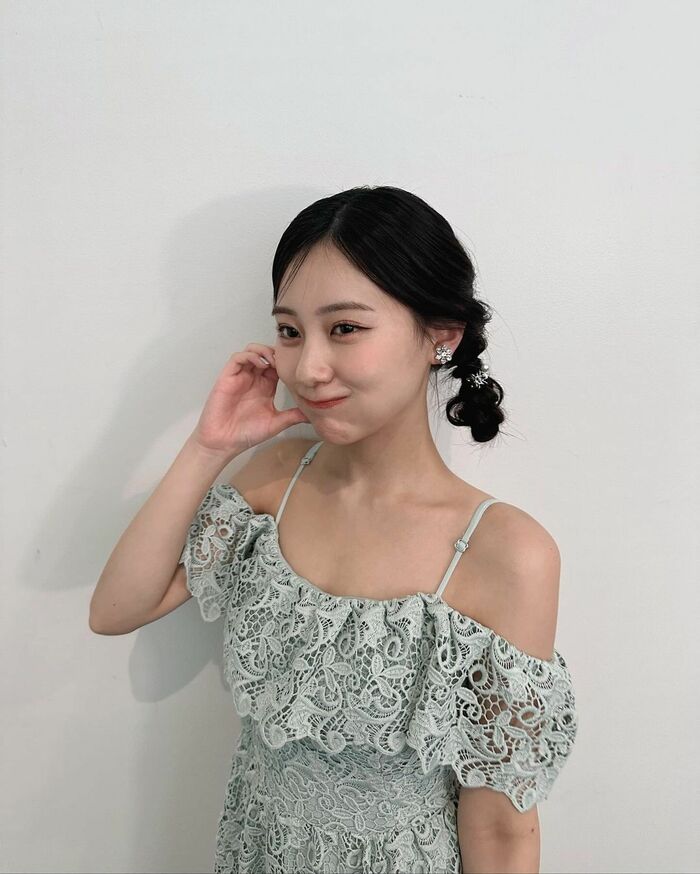 グリーンの透け感があるオフショルワンピースにヘアアレンジをしたコーデはかわいらしい雰囲気に。ほっぺハートポーズをした田中さんが少し頬を膨らませるおちゃめな姿も。
