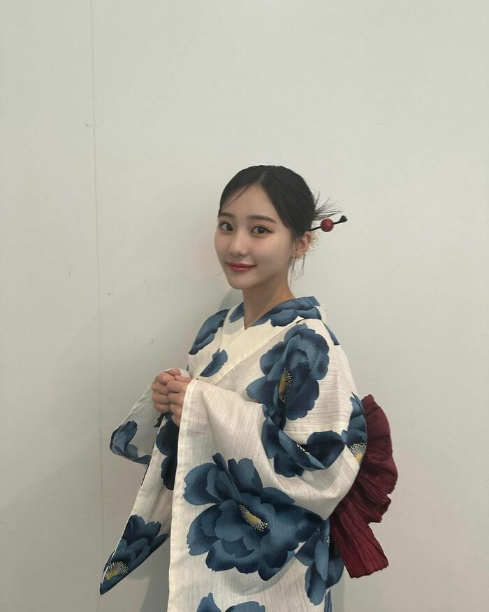 最後は、青の花柄があしらわれた白の浴衣を着用した夏にぴったりのコーデ。後ろ髪をあげ、うなじがあらわとなっており爽やかさ全開です。
