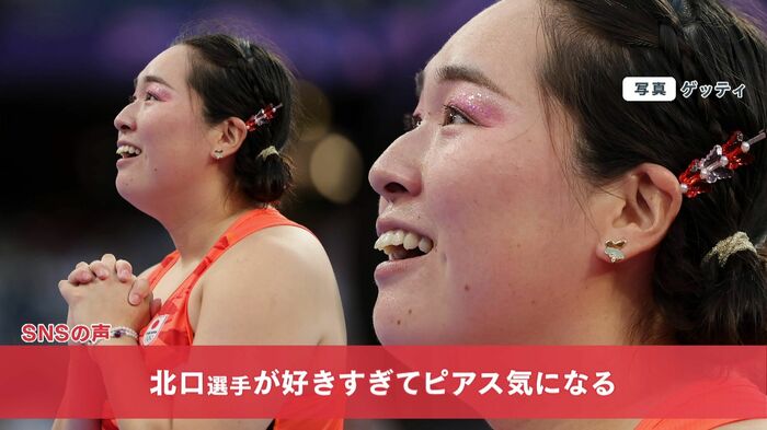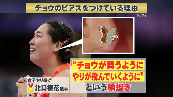 パリオリンピックの女子やり投げで金メダルを獲得した北口榛花選手(26)の耳元にキラリと光る“チョウ”がカワイイと今、話題になっています。