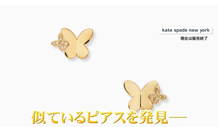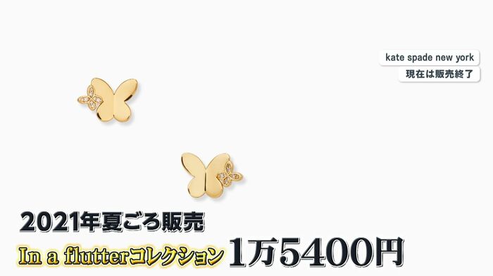 金色のチョウに、キラキラした小さなチョウがあしらわれたデザインで、お値段は1万5400円。2021年の夏ごろに発売された、「イン ア フラッター」というコレクションのピアスで、蝶がひらひらと舞う姿を表しているそう。