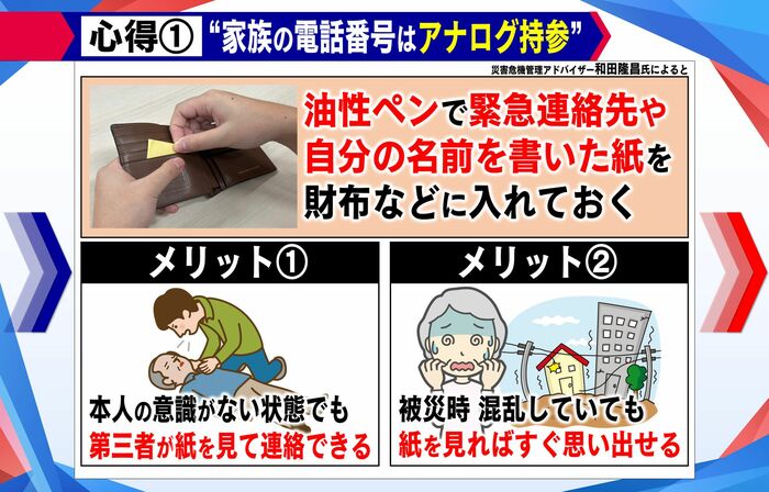 ・メリットとしては、本人の意識がない状態でも第三者が紙を見て連絡できること、被災時、混乱していても紙を見ればすぐ思い出せる。