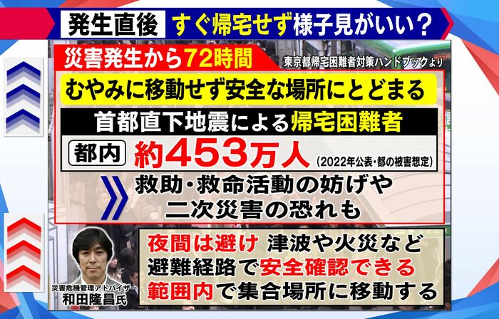 首都直下地震による帰宅困難者は都内で約453万人になると予測され、救助・救命活動の妨げや二次災害の恐れもあります。