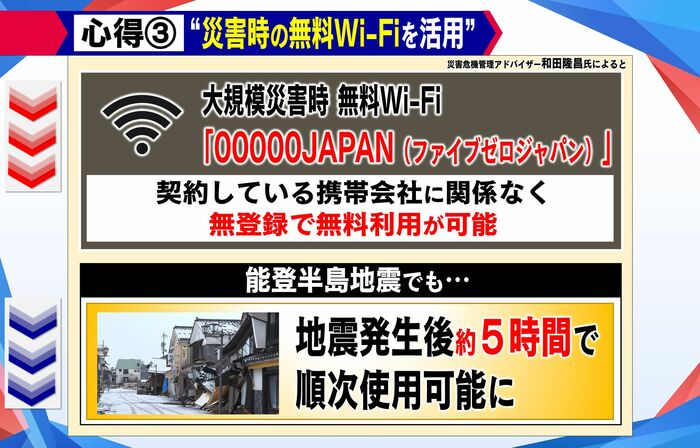 大規模災害時の無料Wi-Fi「00000JAPAN(ファイブゼロジャパン)」は契約している携帯会社に関係なく無登録で無料利用が可能。
