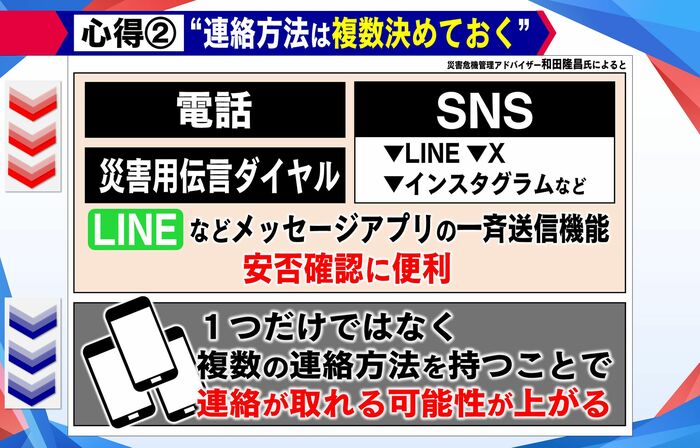 ・電話、SNS(LINE、X、インスタグラムなど)、災害用伝言ダイヤルなどから1つだけでなく、複数決めておく。