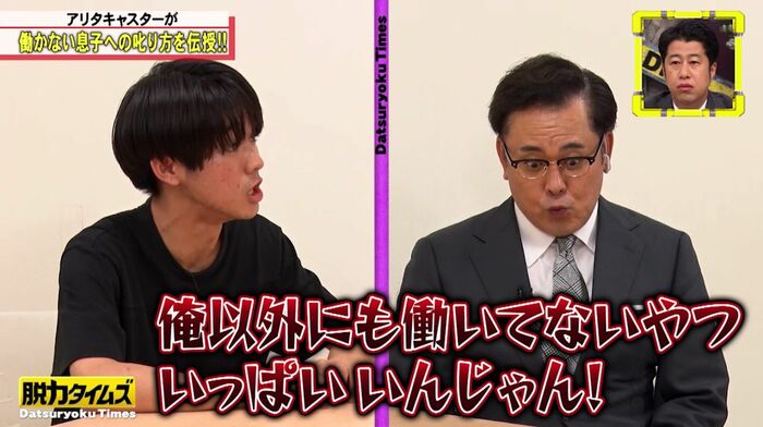 キャスターアリタは、父親に代わって「無職でひきこもる息子」を叱ろうとするも、「おめぇ、うるせぇんだよ!なんで、俺に説教たれてんの?」と反抗されて尻込み。