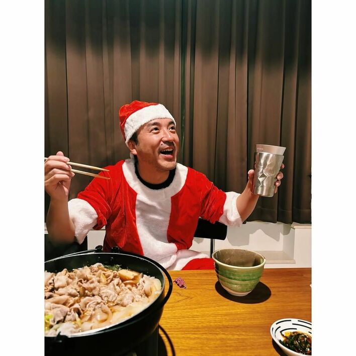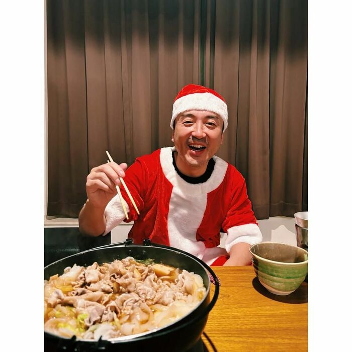 サンタクロースの服と帽子をかぶり、箸を持ちながらカメラに優しい笑顔を向けるムロさんに、思わずほっこりしてしまう1枚です。