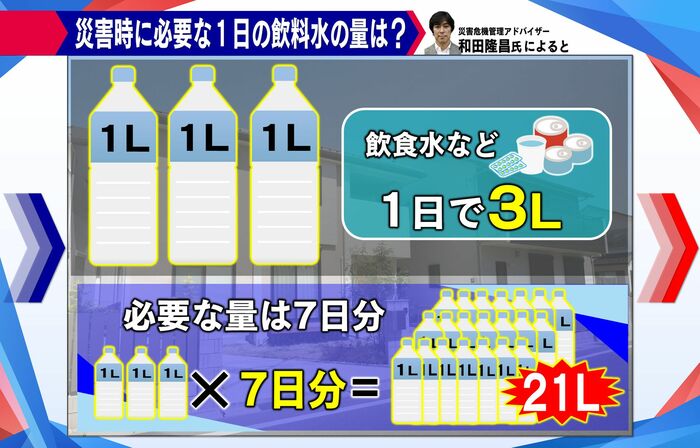 南海トラフというのがインフラが長期にわたって止まってしまう可能性がある。あとは給水などのシステムがなかなかうまく回らない可能性があるので、7日間という想定で政府は推奨しています。