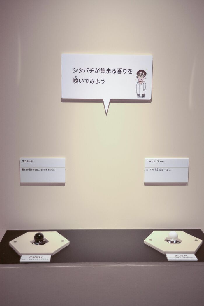体験コーナーは他にも、顕微鏡でクロカタゾウムシの「あしのうら」を覗き見たり、シタバチを引き寄せる「におい」を嗅いでみたり、生体展示もあったりと、様々な趣向を凝らした展示で楽しませてくれます。