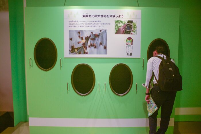 こちらは、「素数ゼミ」の鳴き声を体験できるコーナー。「素数ゼミ」とは、17年、13年周期で大発生するセミのこと。決まった周期で大発生するだけでなく、複数のブルード(年次集団)が重なることが基本的にないなど、未だに大いなる謎を秘めた存在です。