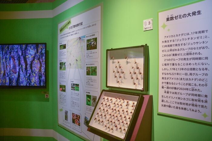 そんな素数ゼミが、2024年にアメリカ・イリノイ州で221年ぶりに大発生。17と13の公倍数である221年という年に2つの年次集団の発生が重なったという、記念すべき世紀の大発生の様子を本展ではしっかりとレポート。その際に採集したセミの大合唱を体験できます。