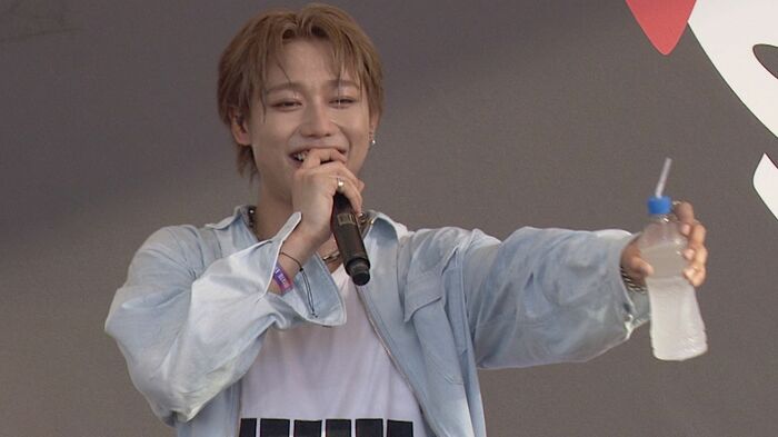 観客にも水分補給を促していると、NAOYAさんが「かんぱーい!」と水を持って乾杯するしぐさを見せます。続いてSEITOさんも歩きながら「はい!かんぱーい!」と観客に向かって手を伸ばし、RYUKIさんも「僕もかんぱーい!」と同じように水を掲げました。