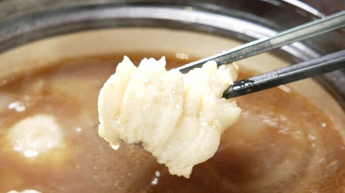 続いては、ハモの濃厚なだしでいただく「はもすき」を実食することに。「はもすき」には3日間熟成したハモが骨切りにして提供されます。ハモの皮と身が市松模様のように並んだあまりの美しさに、松岡さんは、「光ってますよ!」と感嘆の声をあげます。