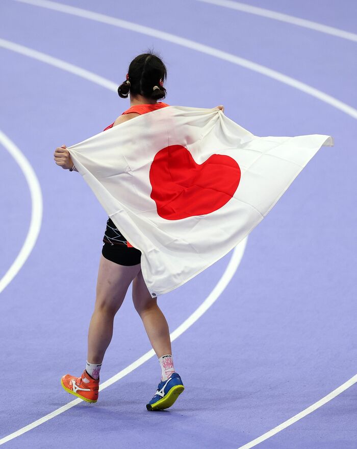 寝そべりカステラもぐもぐ姿が「かわいい」と話題の北口榛花 金メダル決定直後に日の丸を背負ったら“奇跡の1枚”に!