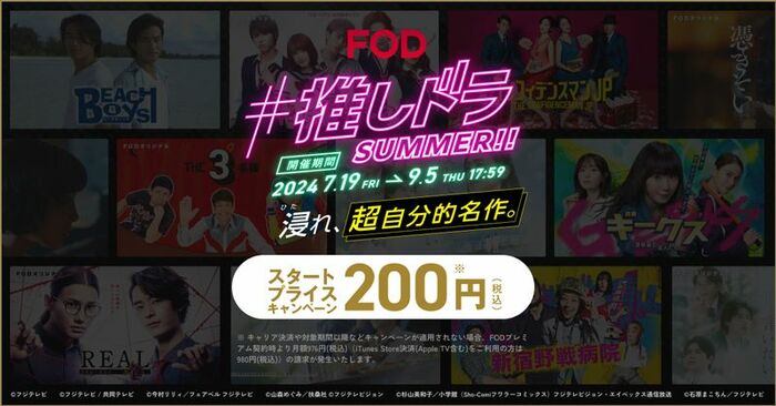 「#推しドラ SUMMER!! 浸れ、超自分的名作。」キャンペーンでは、この夏をもっと楽しめる「推しドラマ」として特設ページにて『ビーチボーイズ』『ウォーターボーイズ』『恋仲』『ロングバケーション』といった過去の名作ドラマ、『海のはじまり』『ビリオン×スクール』『新宿野戦病院』FODオリジナル『THE3名様Ω』『REAL 恋愛殺人捜査班』などの最新作のドラマを豊富にラインナップしています。