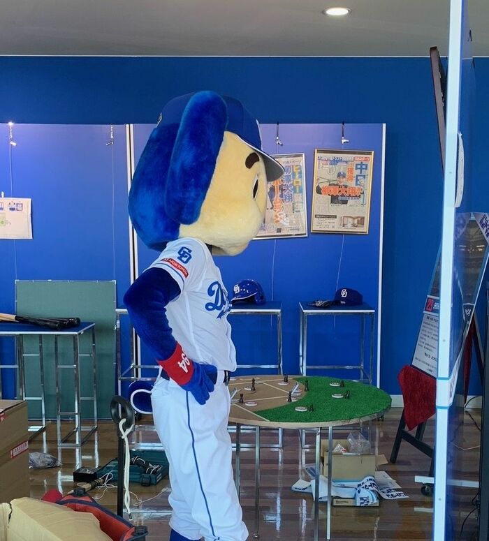 ブースの設営中にやってきたのは、柳澤大翔の大先輩、ドアラ!