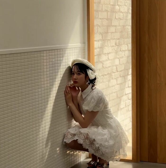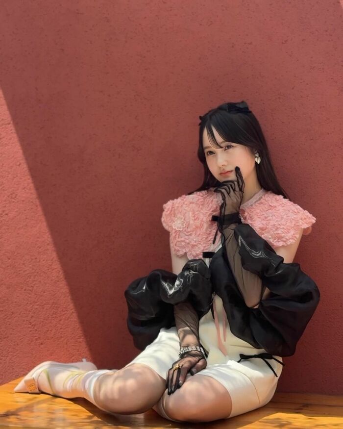 ピンクや黒の衣装を着て座り、大人っぽい表情を見せるショットも。