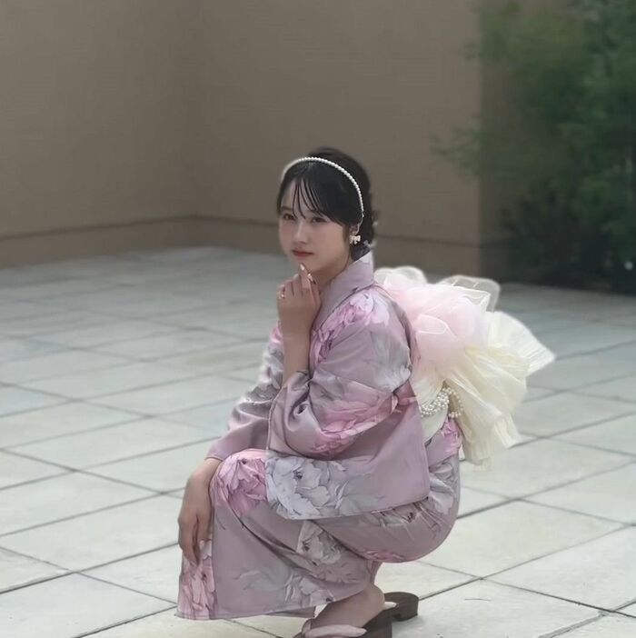 さらに、ピンクの花柄に白色の華やかな浴衣でパールのカチューシャを付けた姿や…