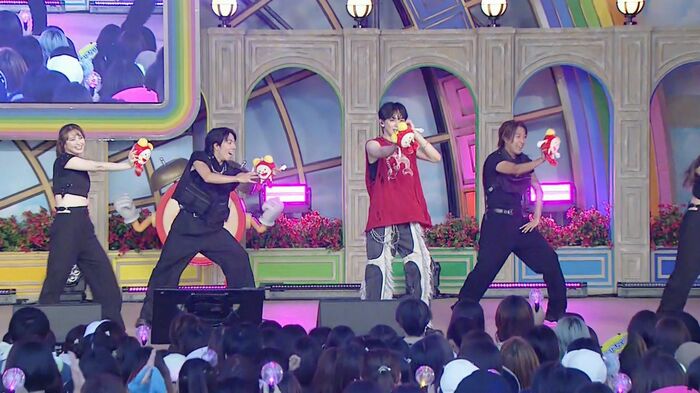 ステージを左右に動き回り、時にめざましくんをなめらかにゆらしたり、ダンサーの持つめざましくんと絡ませたり。ノリノリな観客の様子に「もっと!」「いいよ!」とさらにヒートアップしていくRyubiさん。曲の最後には客席にめざましくんを投げ入れるサプライズも。