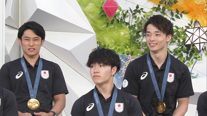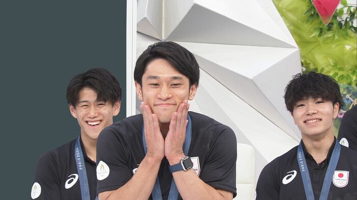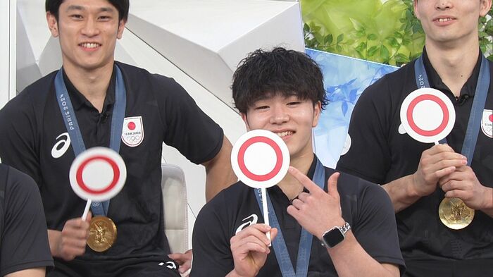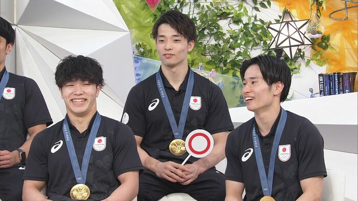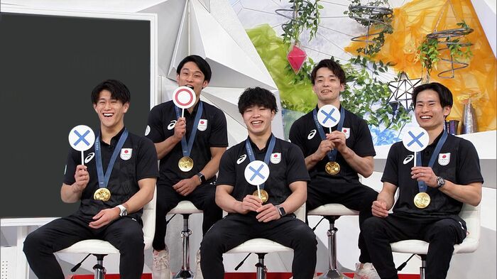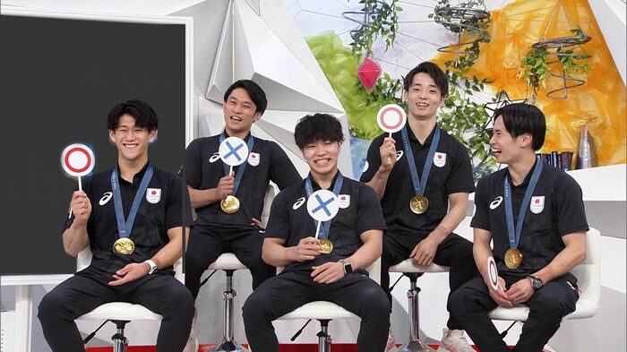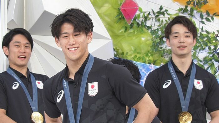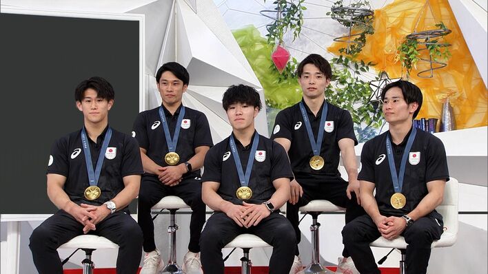 「めざまし8」のスタジオに、見事金メダルを獲得した体操男子団体の、橋本大輝選手、岡慎之助選手、萱和磨選手、谷川航選手、杉野正尭選手がやってきてくれました!凱旋後、テレビ初出演です!