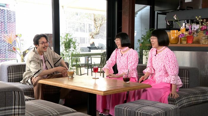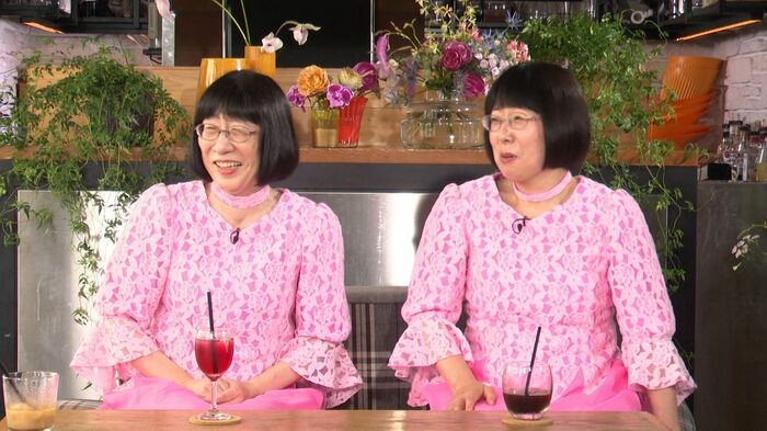 今日の衣装、中のシャツがピンクで、衣装さんが阿佐ヶ谷姉妹のオマージュとしてピンクを用意してくれた。