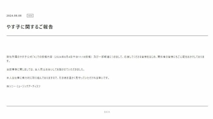 やす子公式「X」での投稿内容(2024年8月4日午後11:18投稿)及び一部報道につきまして、応援してくださる皆様をはじめ、関係者の皆様にもご心配をおかけしております。