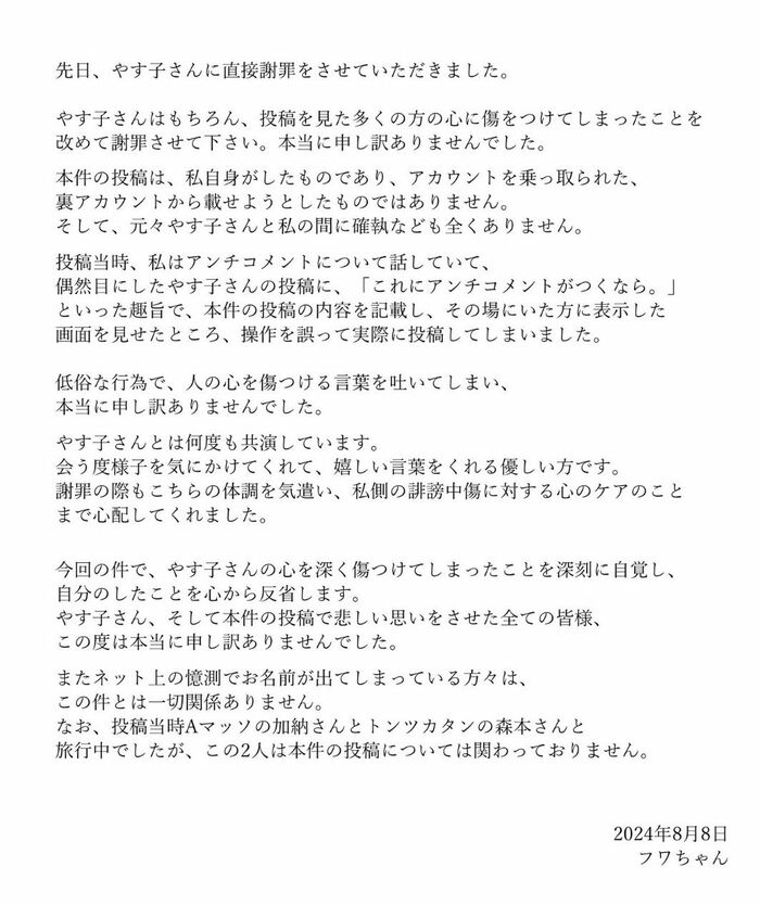 やす子さんはもちろん、投稿を見た多くの方の心に傷をつけてしまったことを改めて謝罪させてください。本当に申し訳ありませんでした。
