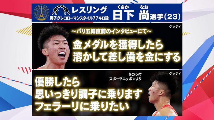 パリ五輪直前のインタビューでは、「金メダルを獲得したら、溶かして差し歯を金にする」と話し、さらに「優勝したら思いっきり調子に乗ります。フェラーリに乗りたい」とも話していました。