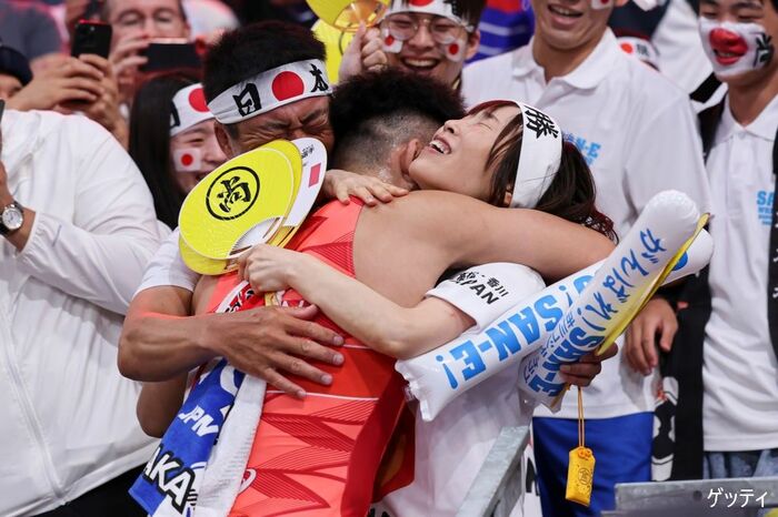 喜びを爆発させた日下選手。仕切りを跳び越え、真っ先に客席にいた両親と抱き合います。その後も次々と、客席の人々とハグをしました。
