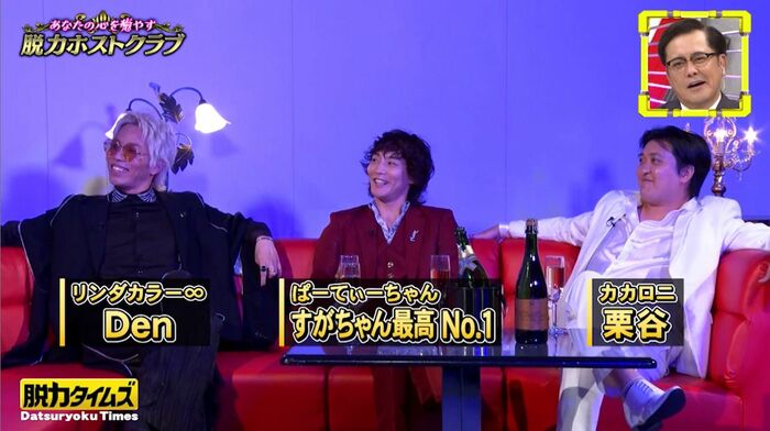 Den(リンダカラー∞)さん、すがちゃん最高No.1(ぱーてぃーちゃん)さん、栗谷(カカロニ)さんによる、カリスマホスト3人衆が、稲田さんを迎えました。