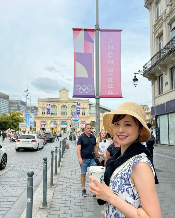 投稿された写真では、フランスのきれいな街並みの中、『PARIS 2024』と書かれた旗の前で、白と青の花柄ワンピースを着た久慈さんがカメラに笑顔を見せる姿が!