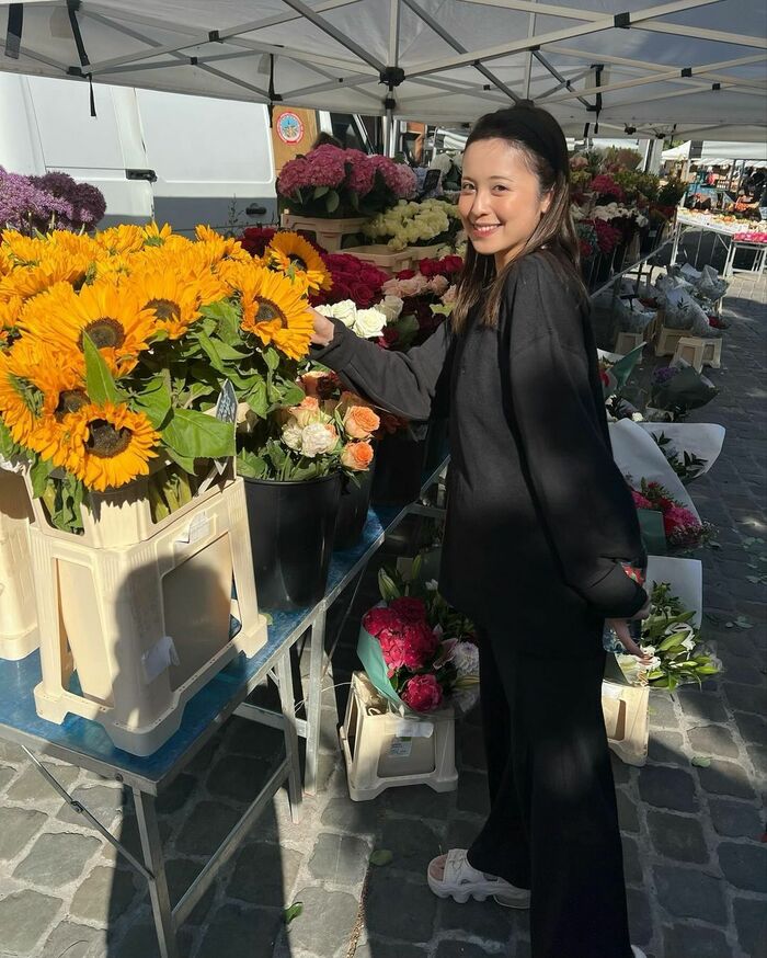 朝のマルシェで黒のふんわりとしたトップスとボトムスを合わせたコーデで、大きなひまわりと一緒に写るショットも!