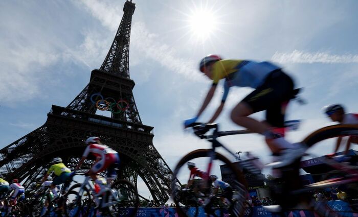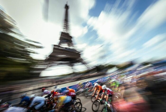 パリの象徴としてたたずむエッフェル塔が躍動感あふれる姿に。自転車競技ならではの1枚として空間を写し出しています。