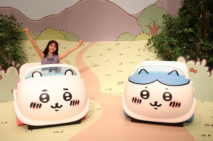 『ちいかわアドベンチャー』には、かわいいフォトスポットとして、タカラトミーの『ドリームトミカ SP ちいかわ』のちいかわver.とハチワレver.が実際に乗れるサイズになって登場しています。