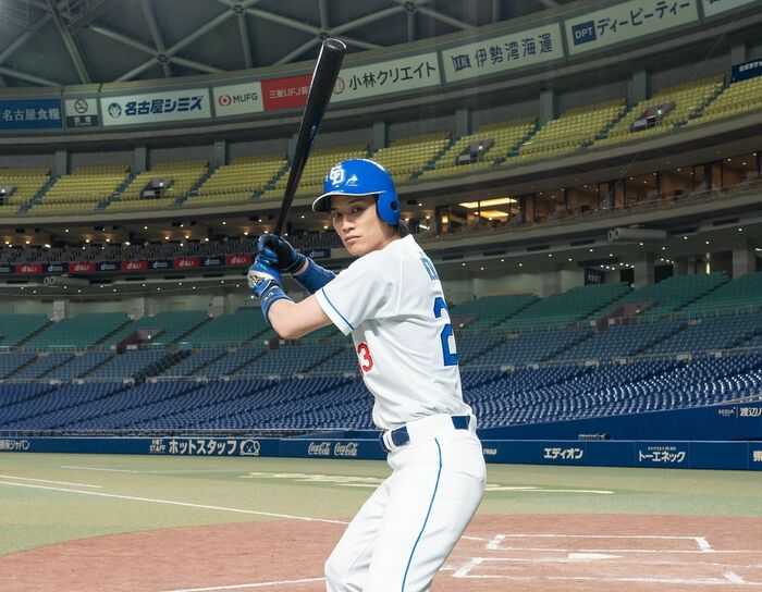 鈴木さんも、中学まで地元のクラブチームで4番バッターとして活躍。撮影は、ドラゴンズの本拠地・バンテリンドーム ナゴヤでも行われ、背番号23、ドラゴンズのユニフォームに身を包み打席に立つ姿は、プロの選手と見間違うほど。何度もドームに快音を響かせています。