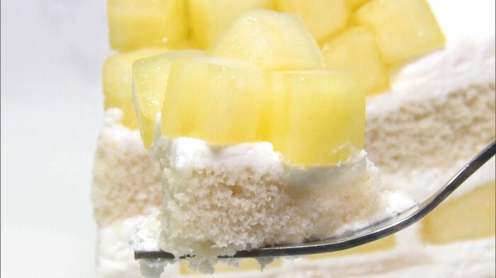 ふわっとした生地に口当たりなめらかな生クリーム、甘くて瑞々しいメロンの味わいが口いっぱいに広がる逸品です。