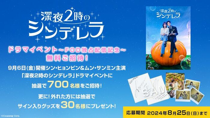 抽選で700名様を、9月6日(金)開催「『深夜2時のシンデレラ』ドラマイベント~FOD独占配信記念~」へご招待、残念ながらイベントご招待の抽選に外れてしまった方の中から合計30名様に直筆サイングッズをプレゼントします。