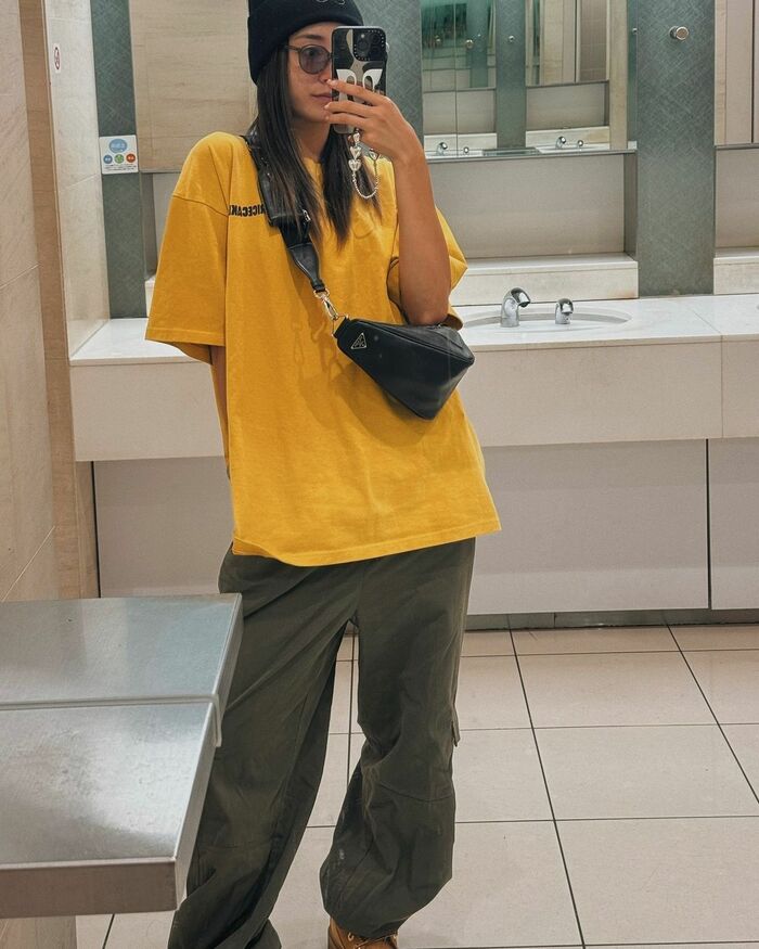 さらに、黒の帽子を被りサングラスをかけ、黄色のゆるっとしたTシャツにカーキ色のパンツ姿での鏡越しショットなどが公開されています。