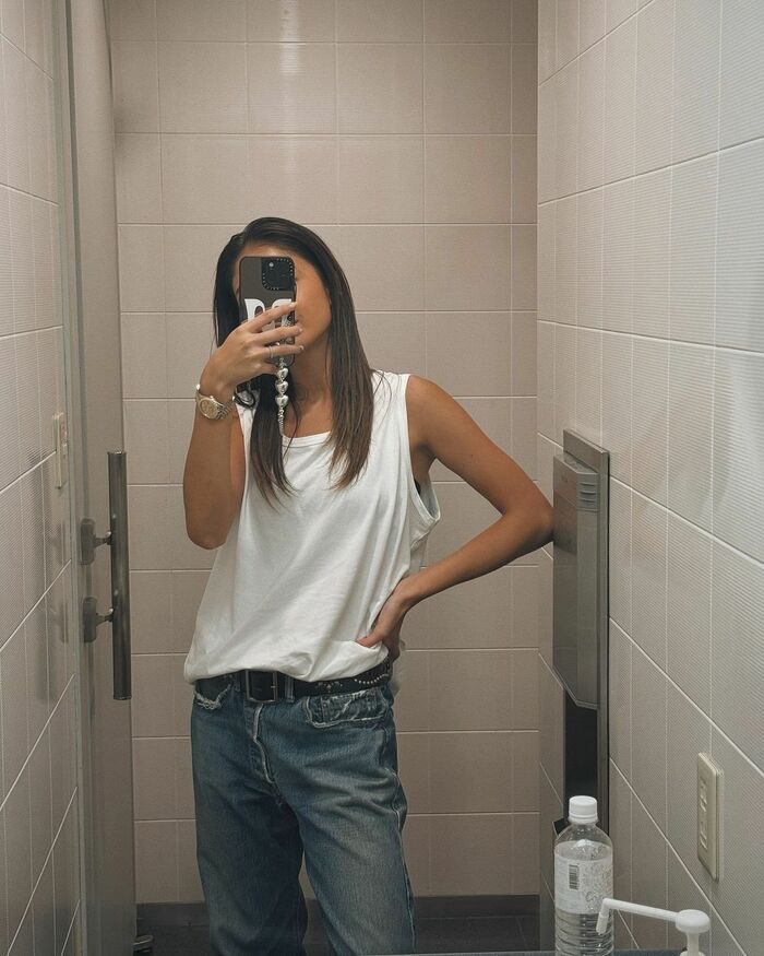 白いタンクトップにデニム姿で腰に手をあてた写真。