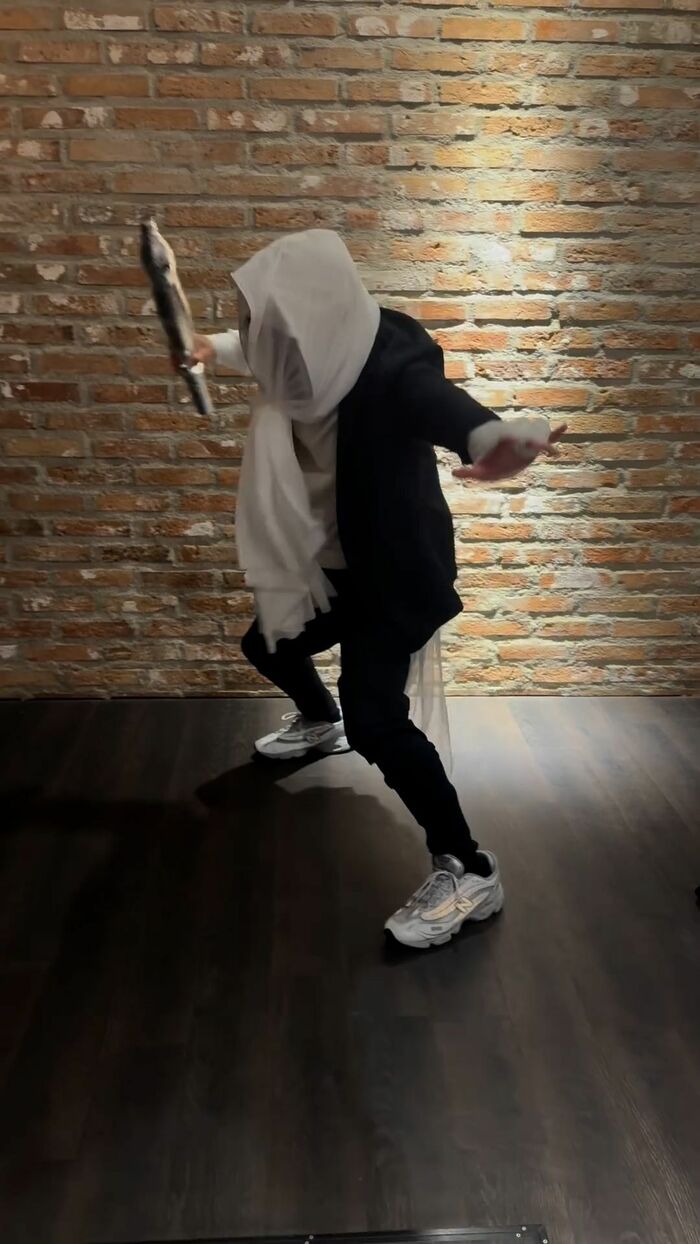 パリオリンピックの開会式に登場した謎の覆面聖火ランナーのものまねを披露しました。