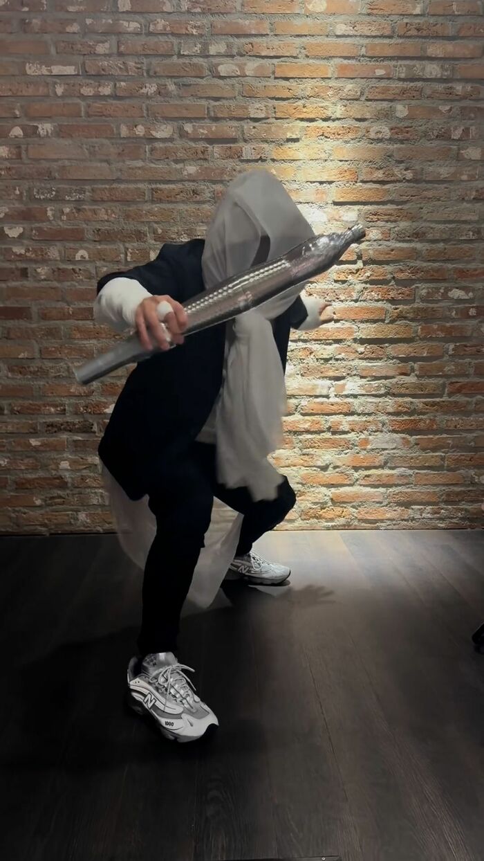 フードだけだった頭と、腰に白いスカーフを巻き、聖火トーチそっくりのシルバーの棒を持ったRGさんは、腰を落とし体勢を低くして機敏に動く姿を見せ、その姿はもはや開会式に登場した謎の聖火ランナーそのものです。