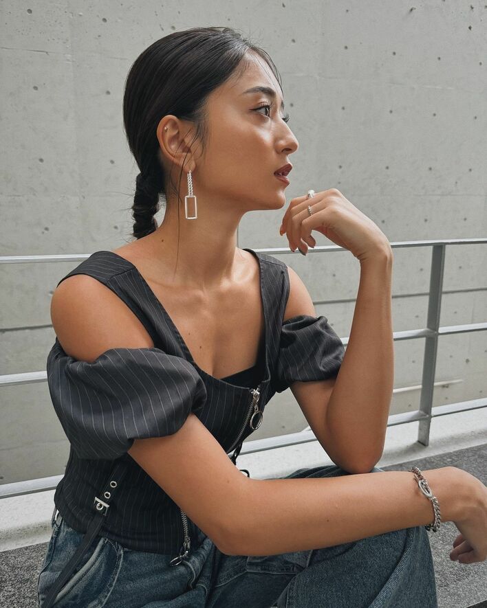 ベンチに座ったみちょぱさんは、デコルテと肩を大胆に出したパフスリーブで、横を向き首筋から胸元までこんがりと焼けたセクシーな小麦肌を披露しました。