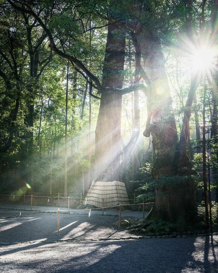 「皆が大好きなあの御神木に眩しすぎる来光が、、なんともありがたい写真が撮れた」と、木の間から太陽の光が御神木へと差し込む幻想的な空間のショットを公開しました。